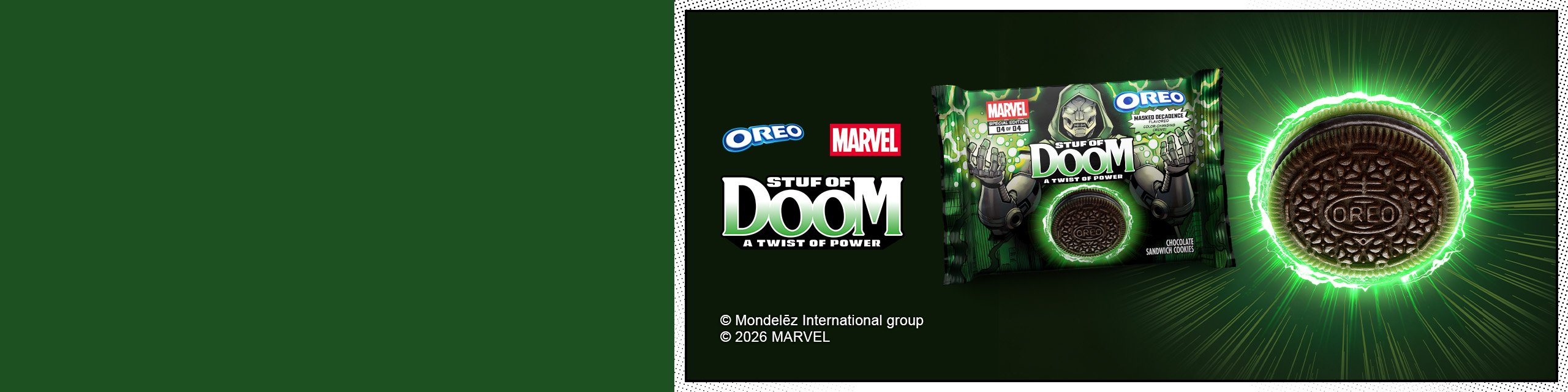 Experience the limited‑edition MARVEL™ OREO Stuf of Doom Cookies, a bold mash‑up of iconic MARVEL design and classic OREO. Each cookie pairs an exclusive Marvel Legends Doctor Doom with a Masked Decadence creme that delivers toasted marshmallow flavor and transforms from black to green when licked. Perfect for collectors, MARVEL fans and OREO lovers, these cookies add a touch of super‑powered fun! Power up your snack time and grab a pack in store or online at Pavilions near you today!